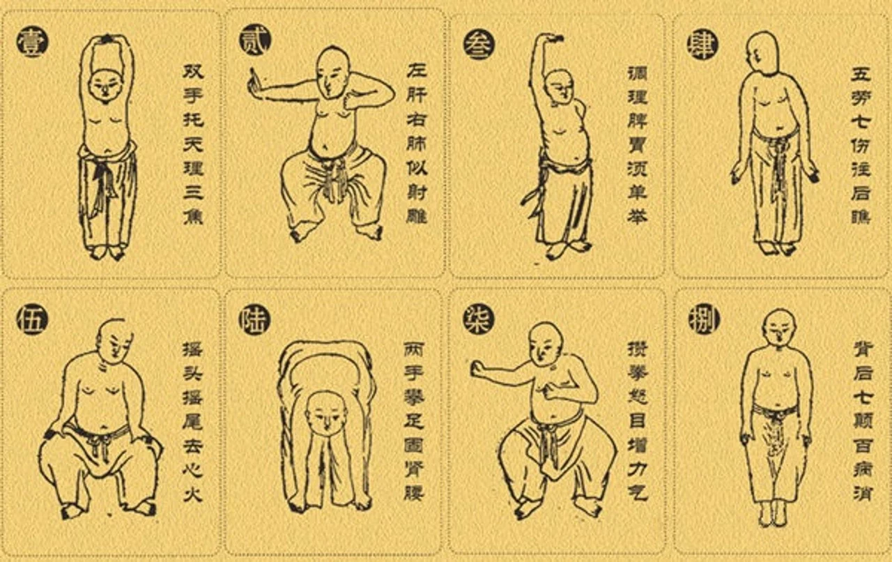 Ba Duan Jin“ (八段錦 – Acht Brokate), einer der ältesten und bekanntesten Qigong-Übungsreihen aus China dargestellt. Von Oben links nach unten rechts: