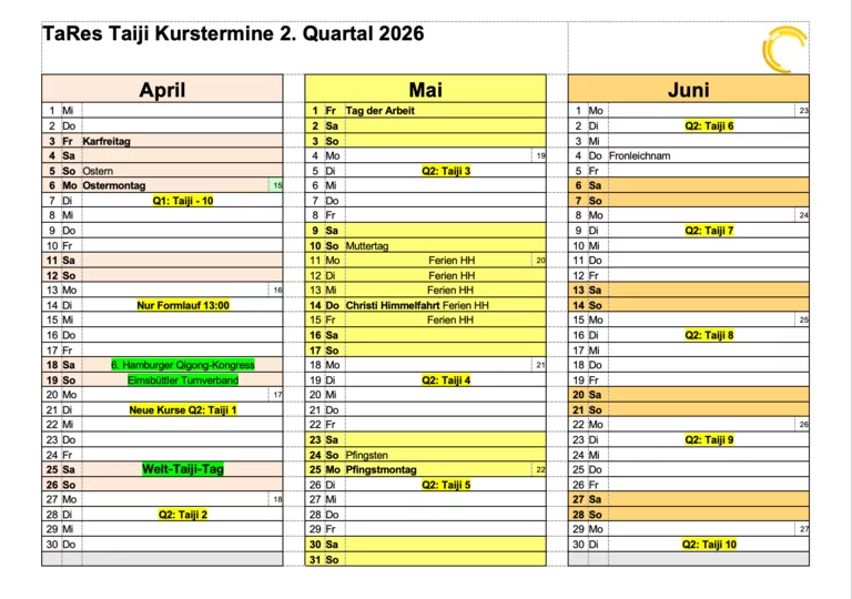 Ab 8. Januar 2026 geht es los. Nun wöchentlich in der Seniorenwohnanlage des vhw Kursen für Senioren. Wir haben Spass bei der Vorbereitung und üben natürlich auch noch ein bisschen zusammen. Wir werden hier verschiedene ZhaoBao Taiji QiGong Sets lernen und unsere fröhliche Rasselbande ist weiterhin fleissig dabei. Ich freu mich auf die Kurse.