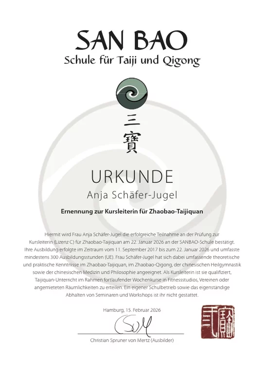 Als vom BVTQ lizenzierte Taiji-Trainerin Prävention (Lizenz E) unterrichte ich Taiji in kleinen Gruppen und im Einzelunterricht. Bei der zentralen Prüfstelle Prävention (ZPP) der gesetzlichen Krankenkassen bin ich anerkannte Trainerin im Bereich
